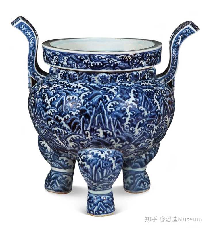 青花寿山福海纹炉上虽然没有书官窑款,但它不仅是明代宣德朝官窑瓷,而且是官窑瓷中的重要器物,炉高58厘米,造型仿青铜鼎。与一般白地蓝花的青花器不同,是蓝地白花,即以青花为地,白釉表现海浪。器物外壁满绘汹涌波涛,并在下腹部加绘山峦叠嶂,寓寿山福海之意。此炉集人文意蕴与高超的制瓷技术于一体,为明宣德官窑器中的黄钟大吕之作。