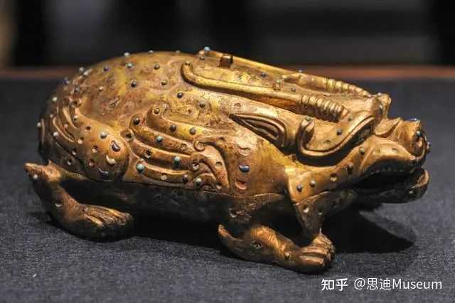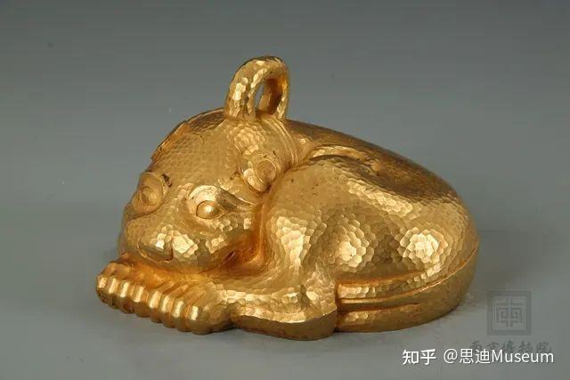西汉金兽,高10.2厘米,身长16厘米,身宽17.8厘米,重达9100克,含金量达99%,是汉代金器制作工艺代表作品,于1982年出土于江苏省盱眙县南窑庄窖藏。 西汉金兽呈豹形,蜷伏状,豹头枕伏于前腿之上颈部戴三轮项圈,头顶有一环纽,通体锤饰圆形斑纹,根据外形特征,推测金兽的铸造时代大约在战国晚期至西汉早期, 是古代金属铸造工艺和金器捶击工艺这两种技法完美结合的产物。