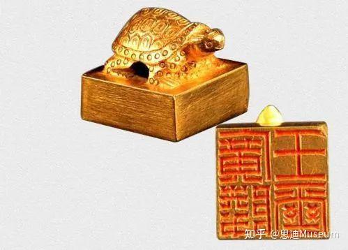 “广陵王玺”金印,通高2.121厘米,台高0.945厘米,重122.87克,具有极高的历史和艺术价值广陵王玺确为龟钮金印,与徐广所记的东汉印制完全相符。以往篆刻家多认为纯金质地过软,不适于雕刻,“必渗以铜,方能成印”。