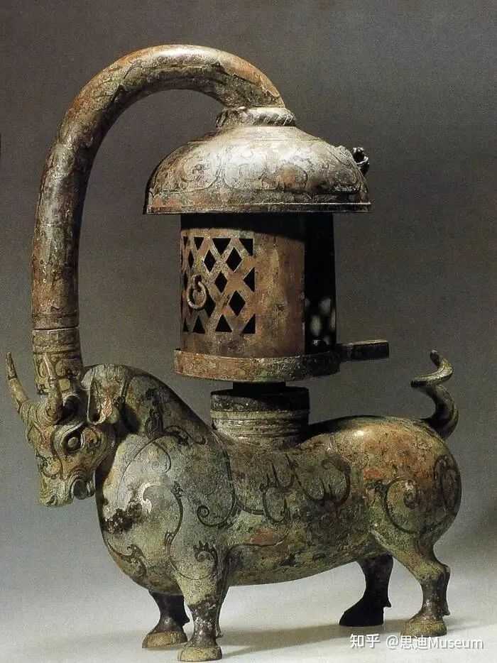 东汉错银铜牛灯,1980年出土于江苏邗江县甘泉2号东汉墓。铜牛灯由灯座、灯盏、烟管三部分组装而成,灯座是一俯首站立、双角上耸的黄牛。牛腹中空,背负圆形灯盘,灯盘一侧设置扁平把手,便于转动灯盘,盘上饰两片可以灵活转动的灯罩,其中一片刻镂空菱形斜方格形纹,起到散热、挡风和调光的作用。