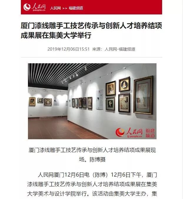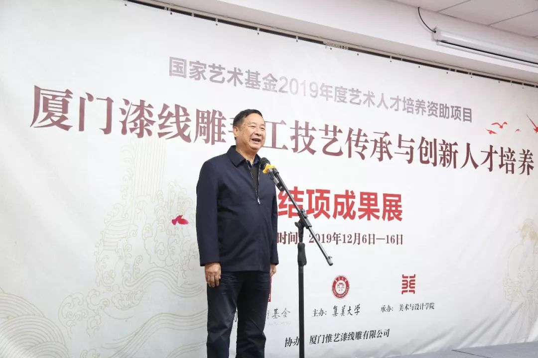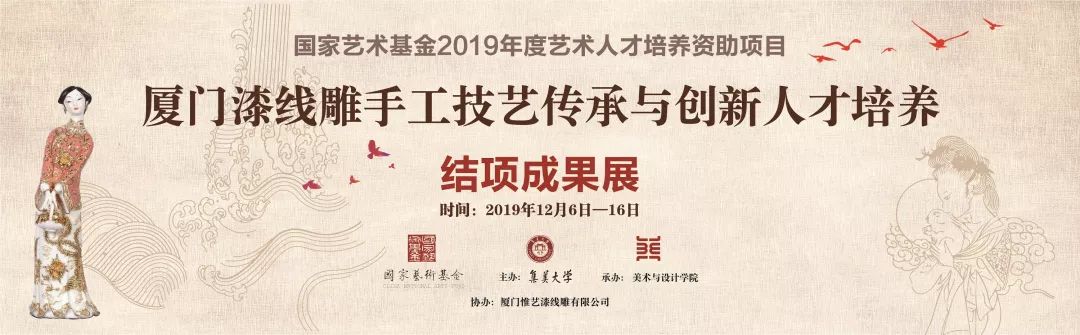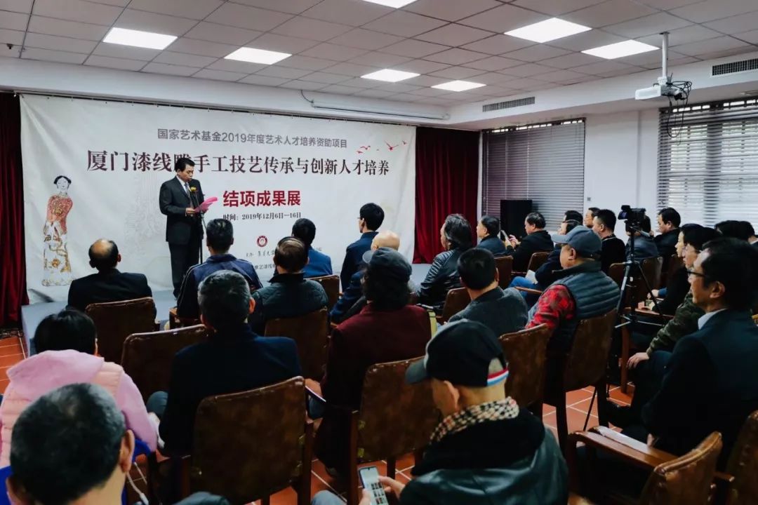 项目主持人、集美大学美术与设计学院院长陈其端表示,2019年度国家艺术基金人才培养项目《厦门漆线雕传承与创新人才培养》从前期准备、学员遴选到集中培训安排合理,充分发挥了自身学科优势和教育资源优势,符合国家艺术基金要求,达到了人才培养的目的。研修班以传承、创新厦门漆线雕手工技艺为办班宗旨,致力于传承厦门漆线雕的制作工艺,创新厦门漆线雕的创作理念与表现手法,实现了传承中的创新、创新中的传承。研修班不仅培养了一批厦门漆线雕艺术创新的骨干人才,而且集体探索了厦门漆线雕的表现手法“扎根传统,开拓未来”这一重大理论与实践课题,对传承和弘扬中华优秀传统文化,增强文化自信,促进民族传统工艺的振兴,特别对推动厦门漆线雕的创新发展将产生积极而深远的影响。同时,项目组也想借此结项成果展,向国家艺术基金汇报,向新中国成立70周年献礼!