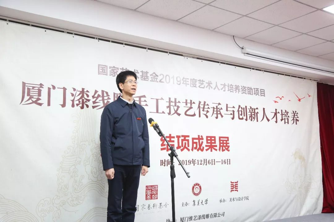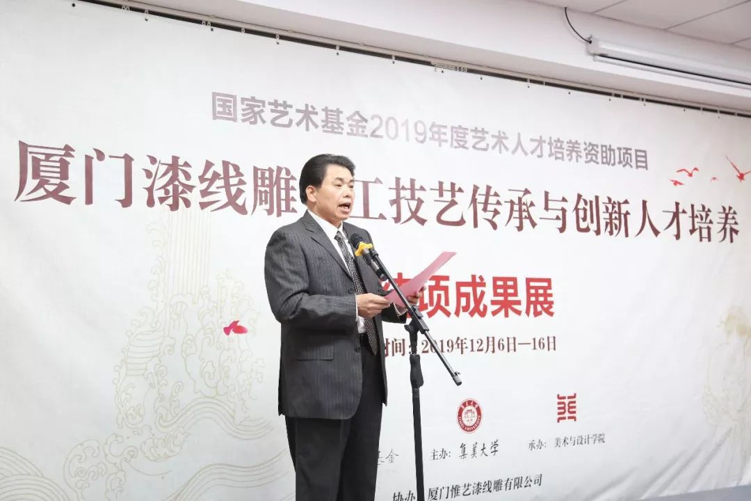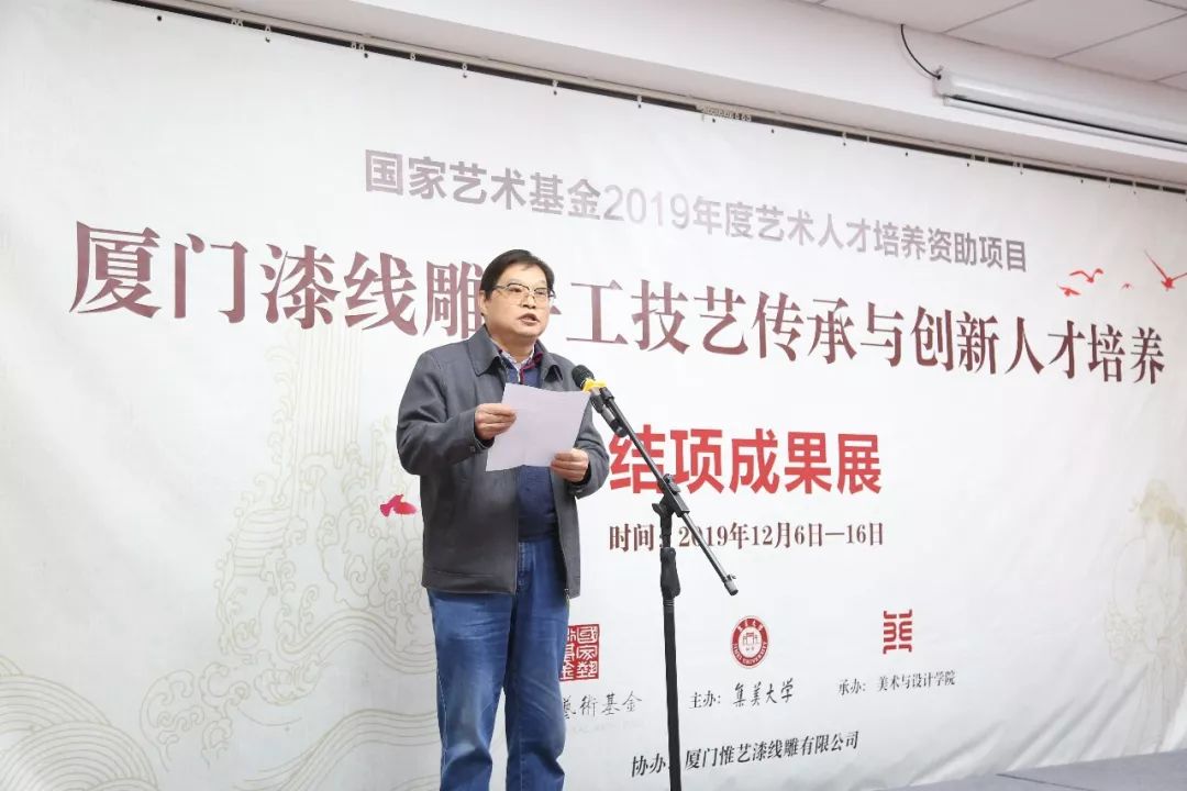集美大学科研处副处长陈发河教授发言,他指出,由集美大学承担的 2019国家艺术基金人才培养项目《厦门漆线雕手工技艺传承与创新人才培养》的学员作品展是国家艺术基金设立以来,首次对厦门漆线雕手工技艺进行的系统学术性展览。通过对各位学员的优秀代表作和工艺制作方法、材料、保护性创新成果的展示,促进厦门漆线雕手工技艺的传播与交流,提升社会对厦门漆线雕手工技艺的保护传承意识和审美水平。本次展览力图从厦门漆线雕手工技艺的地域点位,审读闽南地区的历史文化精髓对厦门漆线雕手工技艺的影响和发展的文化脉络,解析厦门漆线雕手工技艺的优异性和独特性。