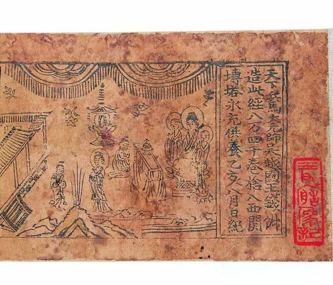 现存世最早,并有明确镌刻时间的唐代版画是敦煌石室发现的《金刚般若波罗密经》扉画,首尾完整,卷首扉画刻印“释迦佛给孤独园长老须菩提说法”图,画面人物衣褶简劲,面容意态生动逼真,绘刻精美。卷末题刻“咸通九年四月十五日王□为二亲敬造普施”,这也是世界上现存最早的一件有明确纪年的印刷品。敦煌石室还发现有单张的雕版印刷品,也都带有刻图,多属佛教发愿文类,每张印品分上下两截,上截刻供养佛像,下截刻印文字。近年中国其他地方也陆续有唐代印刷品的发现,如四川成都、陕西西安等地唐朝墓葬遗址中出土的陀罗尼经残片,也都配刻形态各异的佛像版画,可知唐代这种风气颇盛。