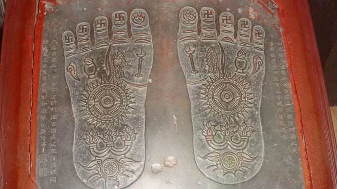 西安大雁塔陈列有一通释迦如来足迹碑,是依据玄奘玉华寺请石匠李天诏所刻制的佛足造像复制而成。