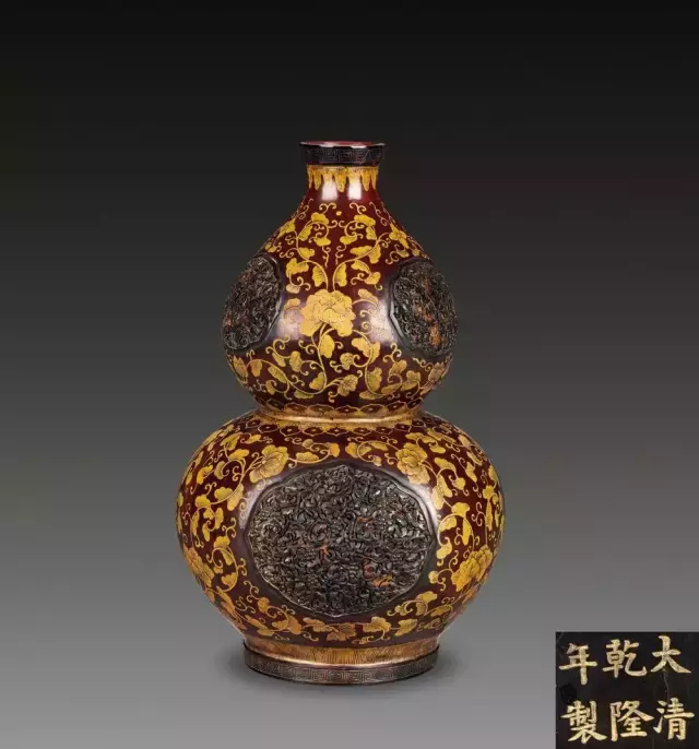 清乾隆 玳瑁金漆缠枝莲纹开光雕松鼠葡萄葫芦瓶