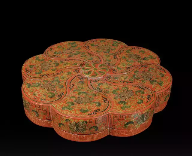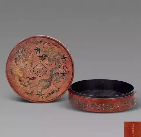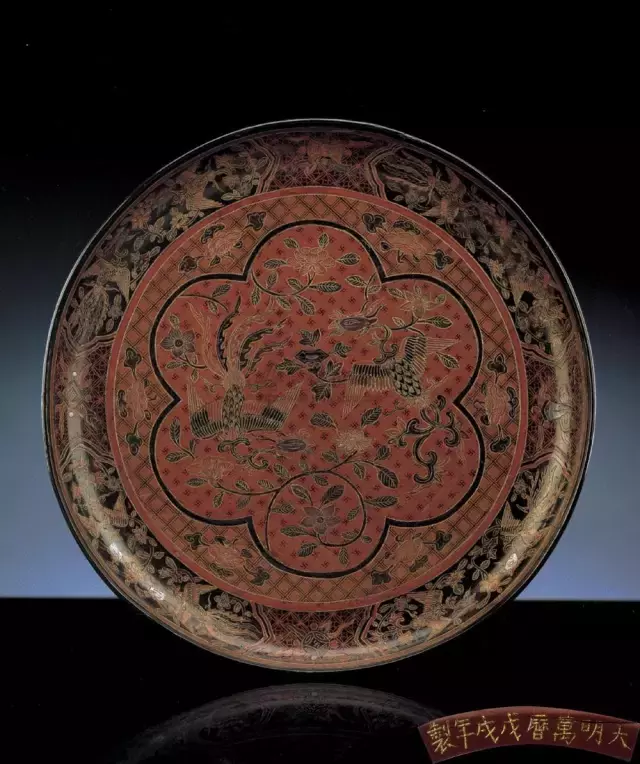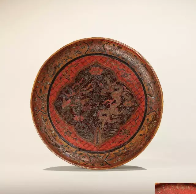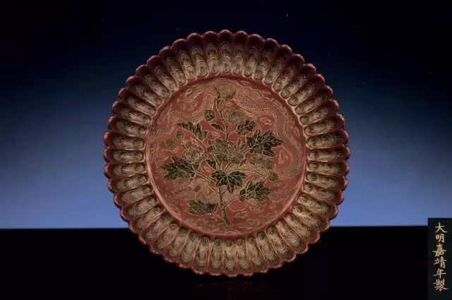 明嘉靖 御制戗金彩漆芙蓉龙纹菊瓣盘