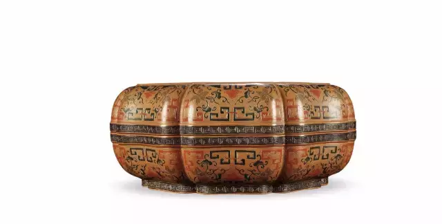 清乾隆 黄地雕填彩漆如意蝠纹菱式式大捧盒