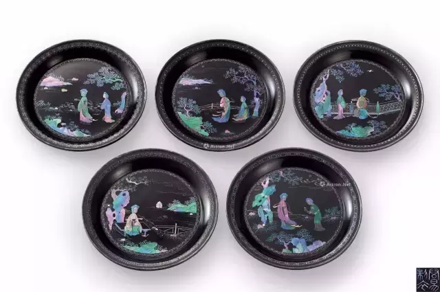 清康熙 黑漆嵌螺钿侍女纹盘 (五枚)