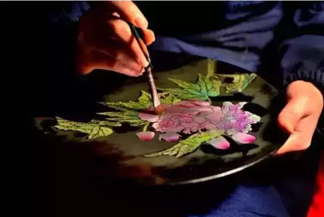 在漆器表面阴刻出花纹后,用不同的色漆填入花纹,干后将表面磨光滑。