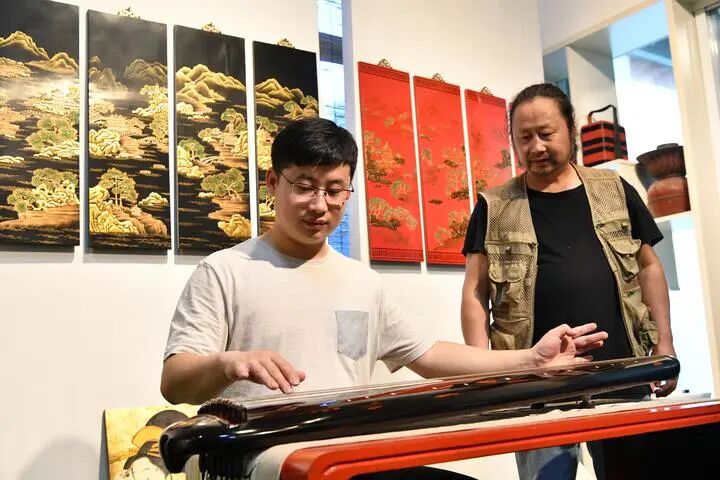 儿子钟奇君是钟大师的骄傲。钟奇君不但获得了金华市工艺美术大师称号,而且在钟宏云眼里,儿子的手艺已经很成熟了,许多作品不亚于自己,有些作品甚至已超过了自己。譬如他独自创作完成的唐代工艺古琴就非常精美,无论是从审美观赏角度还是从实用价值角度看,都是很理想的,许多古琴演奏家和老师都非常喜欢选购。大漆事业后继有人,而且一代胜似一代,这着实令人骄傲啊!