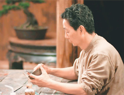 在一个工作台上,一尊红金斑犀皮漆六方大瓶已进入打磨环节。甘而可掬了几捧清水洒在瓶身上,经过清洗,一半的瓶身隐约露出犀皮纹理。甘而可仔细端详后,拿起工具在瓶身上开始打磨。“只有磨平打埝后堆积的层层色漆,漆层的断面和金箔一起构成的美妙花纹才能显现。”甘而可说,纹理显露出来后,精细的抛光还是必不可少。以砂纸和丝绵多次抛光后,再用手掌皮肤反复快速摩擦,漆面才能产生独特的温润光泽。