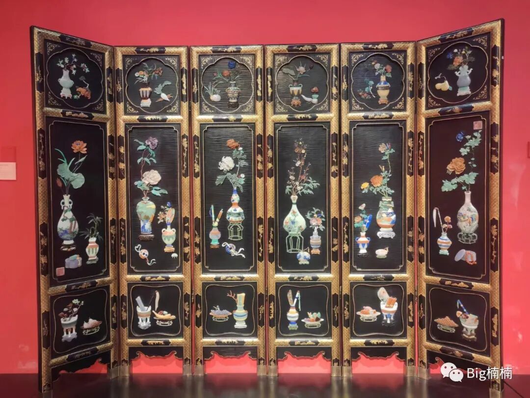 (断纹博古六页屏风,工艺:镶嵌、平金开黑、断纹。)