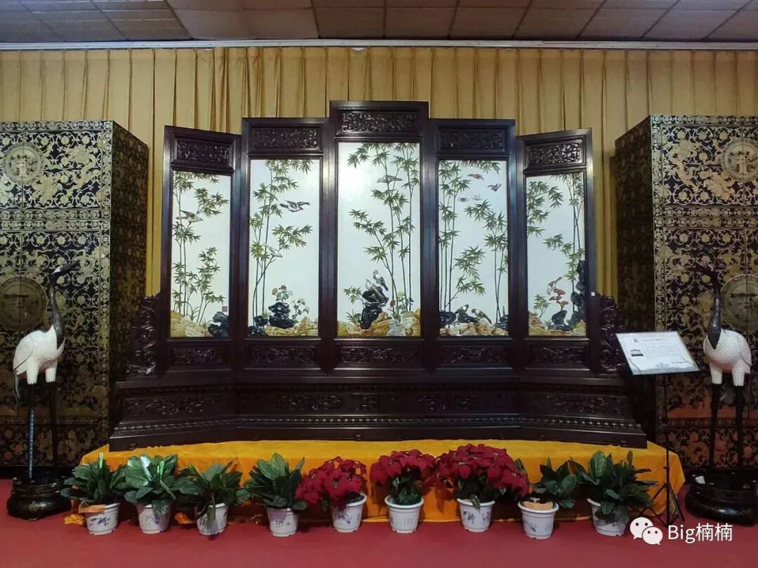 (百宝嵌四季常青屏风,这座屏风是仿故宫长春宫慈禧使用的旧物制造的,白底色的屏风是比较少见的,别具一格。)