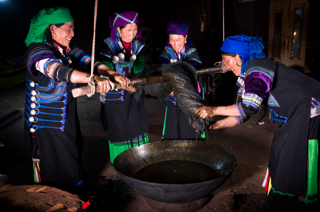 泥染是将蓝靛等染色用料制成膏泥,随后借助马蹄叶草、核桃及马桑树枝叶果皮等纯天然植物媒染剂,再经特有的沼泽泥水浸泡、濯洗等特殊工序,给棉、毛、麻、丝等制品上色的一种印染技艺。