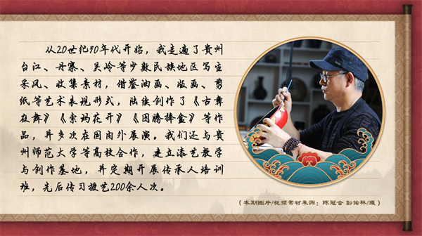 从20世纪90年代开始,我走遍了贵州台江、丹寨、关岭等少数民族地区写生采风、收集素材,借鉴油画、版画、剪纸等艺术表现形式,陆续创作《古彝夜舞》《索玛花开》《图腾捧盒》等作品,并多次在国内外展演。我们还与贵州师范大学等高校合作,建立漆艺教学与创作基地,并定期开展传承人培训班,先后传习授艺200余人次。