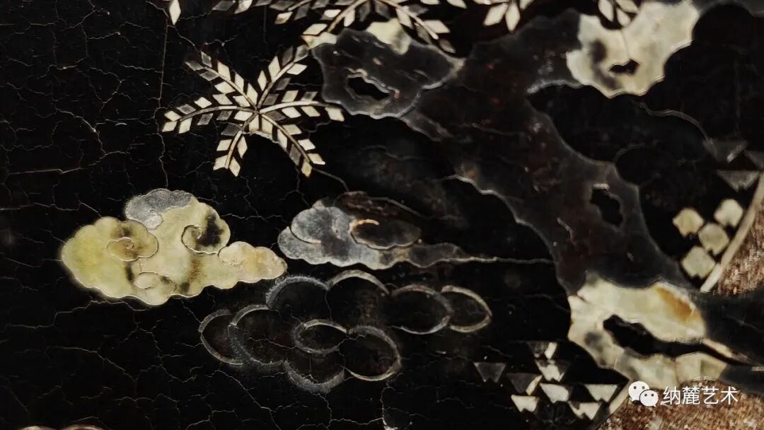 视频中的官皮箱对应以上五点,均可成立。而在基本点之外,原文中“又近有加沙者,沙有粗细”一句亦应引起我们的重视。这句话说的是薄螺钿器物多用螺钿加沙(即碎屑)的手法,沙有粗细,或为树下苔藓,或为石面皴文,或为山头霞气,或为汀上细沙。视频中的官皮箱与此又是完全吻合的。