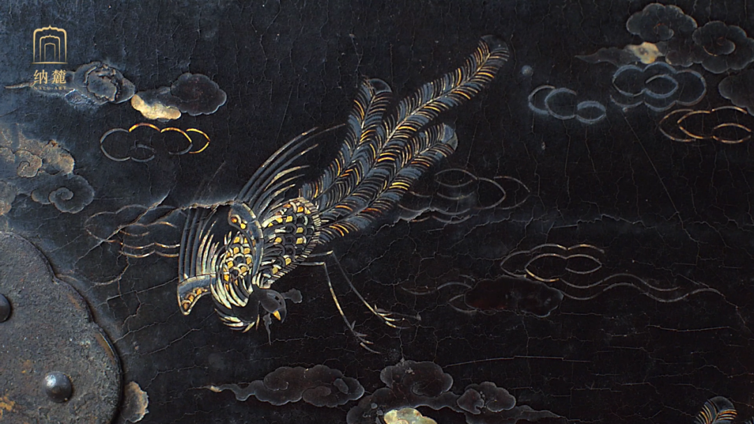 故宫博物院藏有江千里款黑漆嵌螺钿长方盒,盒盖、盒底立墙上下通景,四面各嵌一龙,龙身除用螺钿裁嵌外,龙睛及鳞都间镶金点。若以此与上述凤凰图案作比,便不难发现它们之间的相似性。再结合刘老师在视频中所讲的官皮箱形制、画面题材与铜饰件的时代特征,及与明代《髹饰录》相关工艺记载的对应,此件无款识黑漆嵌螺钿官皮箱被刘老师认定为明晚期江千里之作,我们认为是可信的。