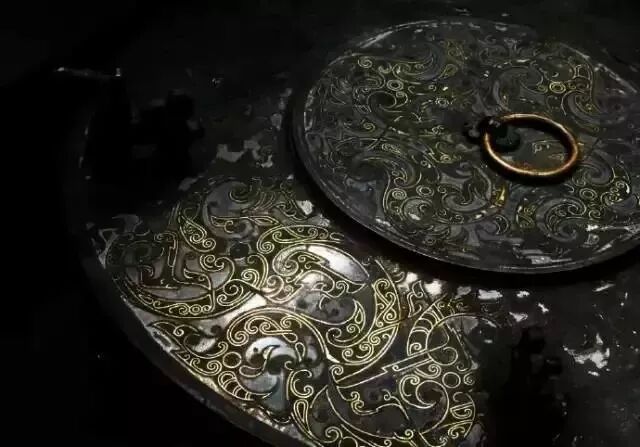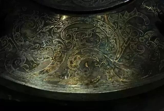 春秋战国时代,将这种贴饰技术发展为“金银错”,即将金银丝纹样镶嵌入器物表面的刻纹之中,陕西出土的战国铜壶就是运用了这一先进的技术。