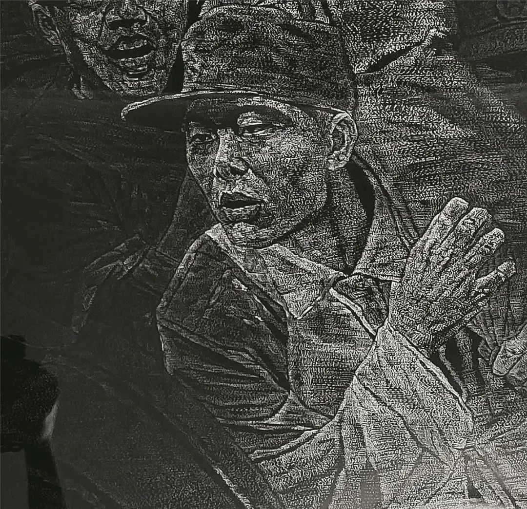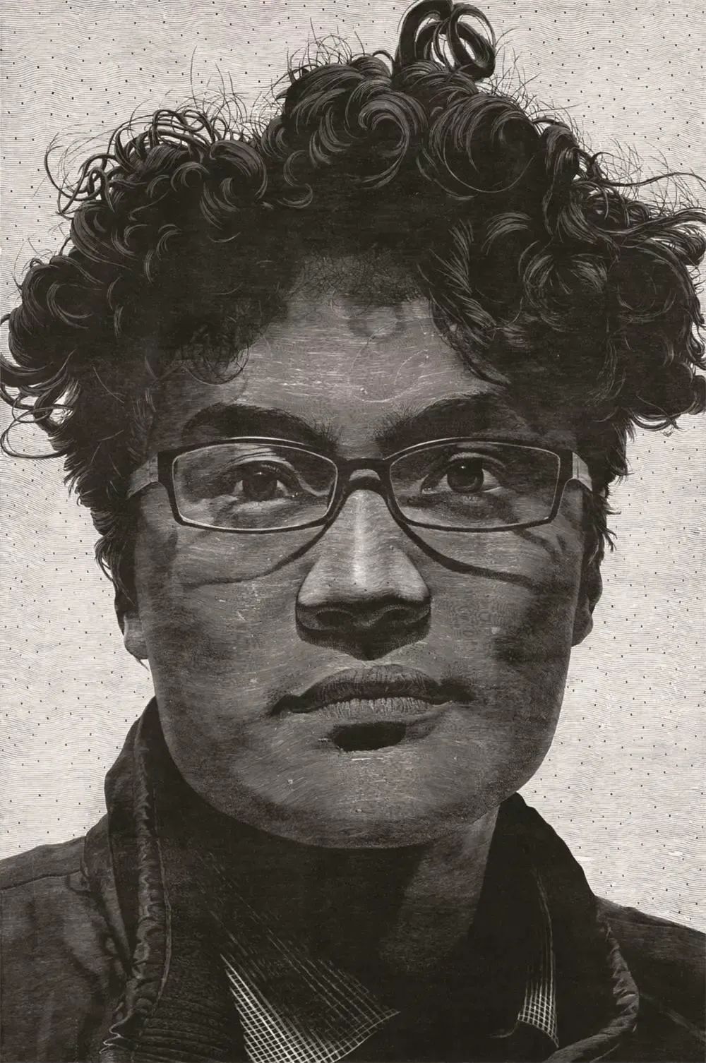 彭伟的《而立之年》以超大的青年人物肖像和木刻艺术深入细微的刀痕,塑造了当代青年励志奋斗、阳光自信的形象,并较好地体现了传统木口木刻的当代图像转换。