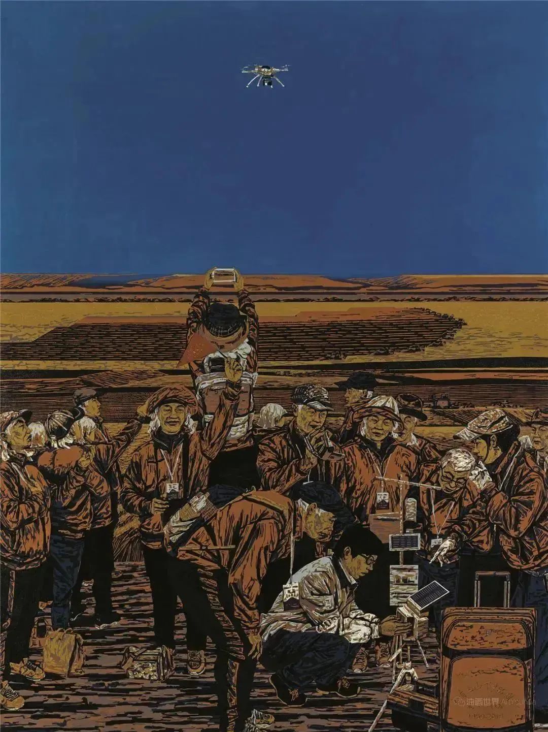 版画作品《金秋时代》表达的是第一代“北大荒人”再次回到北大荒如何来看待北大荒的变化,以往我们的观看经验中,版画表达北大荒多以优美抒情为主,这件作品则刻画了一群已届老年的北大荒建设者漫步智慧农田的惊喜景象,比如画面中出现了现代科技元素。这件版画运用传统彩色套印技巧进行表现,这在艺术处理方法上是颇有难度,运用了层次鲜明的平面化造型语言,布局得当的色块与干脆利落的木刻刀法形成一股合力,使得作品给人一种饱满、生动的艺术气息。