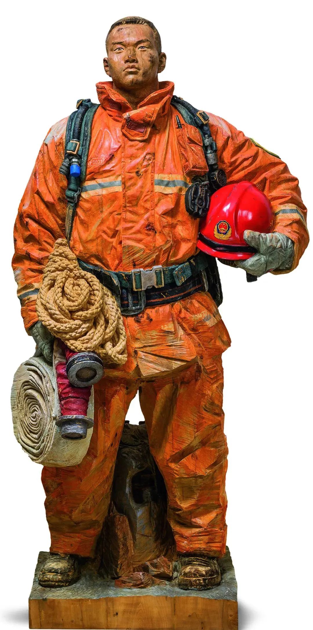 雕塑作品《烈焰青春》,尚辉介绍,第十三届全国美展的获奖作品中,有两件作品都塑造的是消防队员的形象。其中一件采用了平面绘画的形式,而这件则采用了木雕雕塑进行创作。从这两件作品中,我们可以看到一个共同的规律,消防队员表现的是青年人的形象,他们的使命、朝气以及形象内在所散发出来的时代气息都特别鲜明。我们今天在展览现场看到的很多作品不是去讲述一段故事,而是到绘画形象的本体来表现时代人物的形象。此次展览的作品,无论是绘画还是雕塑,他们在艺术语言上都有新的突破和创新。
