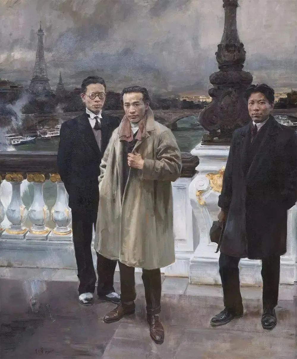 油画《桥上的风景》以肖像画的形式表现20世纪著名美术教育家林风眠、吴大羽、林文铮的欧洲留学生涯。