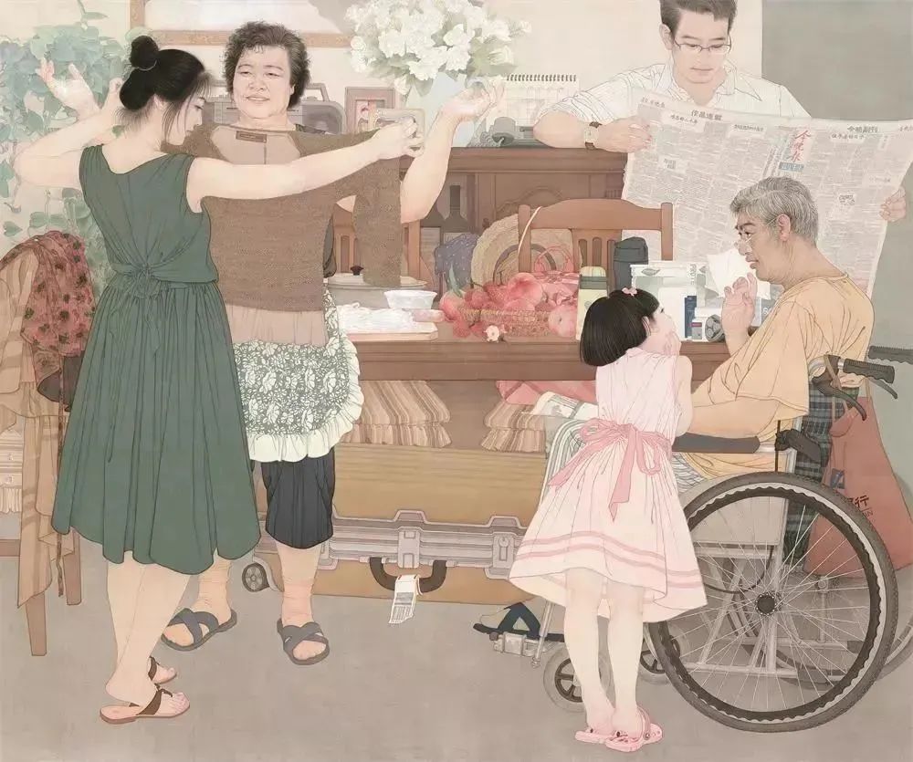 《儿女情长》是当今和谐盛世一幅温馨动人、家和情深的风情画。这是一个普通家庭的普通场景,女儿带着女婿和外孙女回家,女儿给妈妈带去了礼物,外孙女给姥爷带去了柔情,女婿的到来,更增添了家庭的温馨与完满。这既是一个幸福完美家庭的单个场景,又是和谐社会一个个幸福单元的生动缩影。