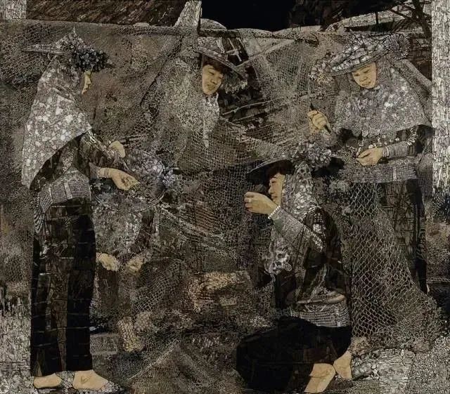 作者张玉惠为闽南人,有条件长期深入惠安女的生活,积累了大量的生活经验与创作素材。在这幅作品中,作者通过对惠安女生活中典型的织网场景的描绘,以委婉的叙事方式呈现了惠安女的人性之美,准确地诠释了惠安女特有的精神品质。梦幻般的画面,将日常劳作场面转化为一首动人的抒情诗。