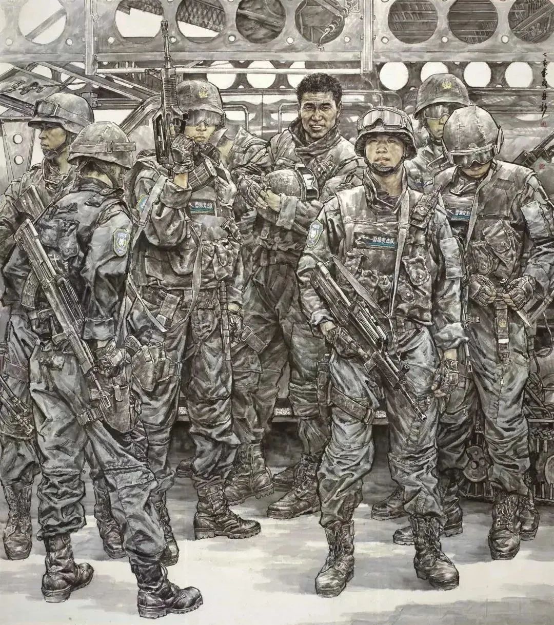 《雪狼突击队》描写的是现在的雪豹突击队,这是一支成立于2002年的国字号反恐部队,当年的名字就叫做“雪狼突击队”。在苗再新的作品里,突击队的队员们全副武装,面容冷峻而英气勃发。