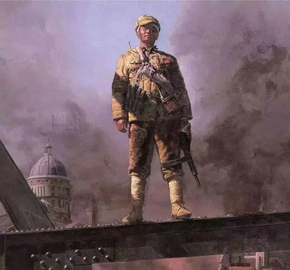 白展望以富有创意的构思,避免对战争场面进行写生式的简单群像刻画,而是选取对一位战士的特写,以小见大地展现了天津战役恢弘壮阔的场面,这样的表达方式甚至比直接表现冲锋陷阵的战争场面更加具有凝重深沉的力量。战士、浓烟、金汤桥、建筑这些形象仿佛在艺术家严谨又不失温情的描绘之下被凝固在那个伟大的历史时刻当中。