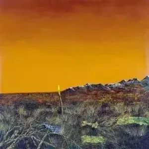 《永恒的的记忆》整幅画面笼罩在橘色的氛围中,画面60%被远景橙色的天空填满,中景是右上蔓延的山峦,近景穿插的草木让整个画面丰富了起来。