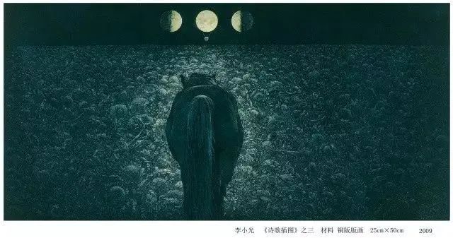 这是一组结合海子的诗歌所作的铜版画插图,李小光对于版画的认知深度不仅仅只是拥有娴熟的技能,更是饱含了技能背后的精神内涵以及对文化的解读。