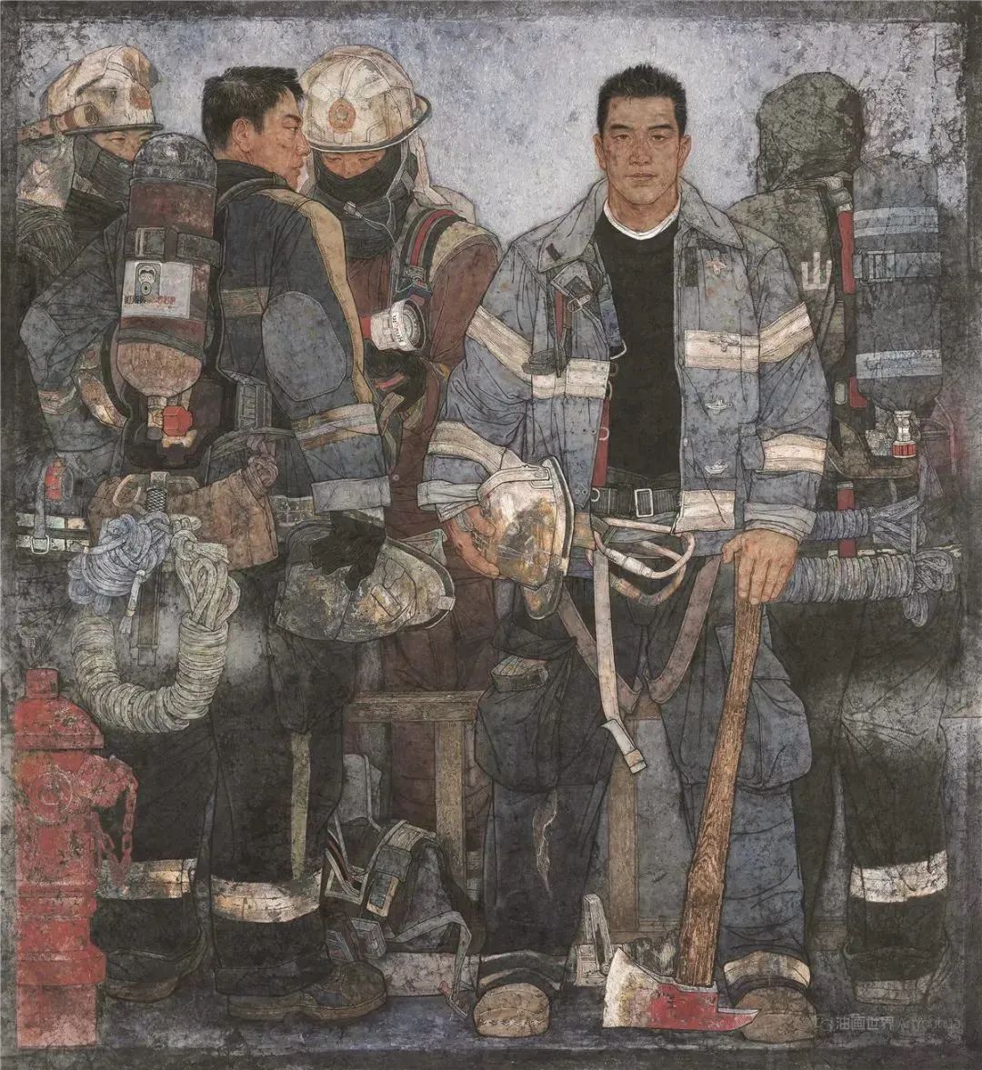 中国画金奖获奖作品《使命》,艺术创作中对于消防队员形象的表现其实是当下很重要的题材,这件作品并没有直接表达消防队员救灾现场的状态,而是表达了消防员刚出火场的艰苦场景,人物形象较为生动,消防员沾满灰尘带有擦伤的脸上,疲惫中透露出沉着、坚毅与顽强的意志。在绘画语言上,这件作品采用工笔重彩的方式,在写实造型的基础上,运用传统的骨法用笔,画面描绘细腻精致,在遵循严谨的人物解剖基础上进行主观变形,魁梧的身躯,配以蓝灰黑色,使人物展现出较强的雕塑感,用丰碑式构图法,视觉冲击力较强。