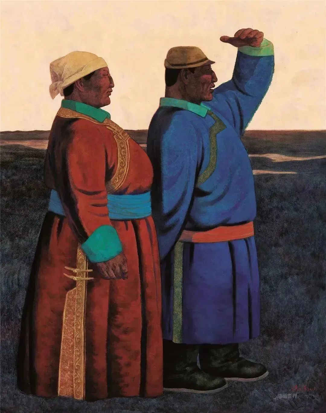 金奖作品《远方》是一件水彩作品,尚辉介绍,这件作品描绘了两个大草原上的人物向远方眺望,用一种简练、概括的人物形象来表达,人物表达却呈现出一种内在的张力。据中国美术家协会水彩画艺委会主任陈坚介绍,这件作品在用彩和水上非常讲究,用笔比较含蓄,作品有着内蒙古族本身特有的精神和特色,其艺术语言有着强烈的时代感和力量感。作者生长在内蒙古大草原,对生长的土地和人民有着深厚的情感。她作品的独特之处在于她水彩语言的当代性探索以及她对生命本身及人与自然等问题的关注和思考。