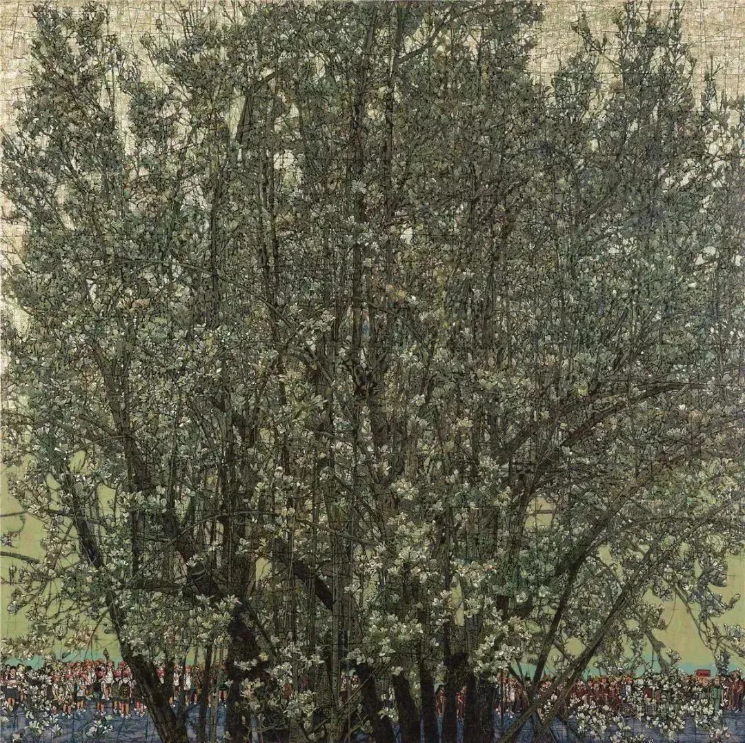 漆画作品《盛世花开》表现的是一丛数,画面下面则是一群少年儿童在瞻仰革命圣地。花树茂盛苍劲,寓意祖国的未来和国家的希望。这件作品在漆画艺术语言上进行了很多突破,画面基调统一,其中的很多细节值得细细品读,并用漆艺和贴箔等手法相结合,在漆画的艺术语言上有了很多突破。