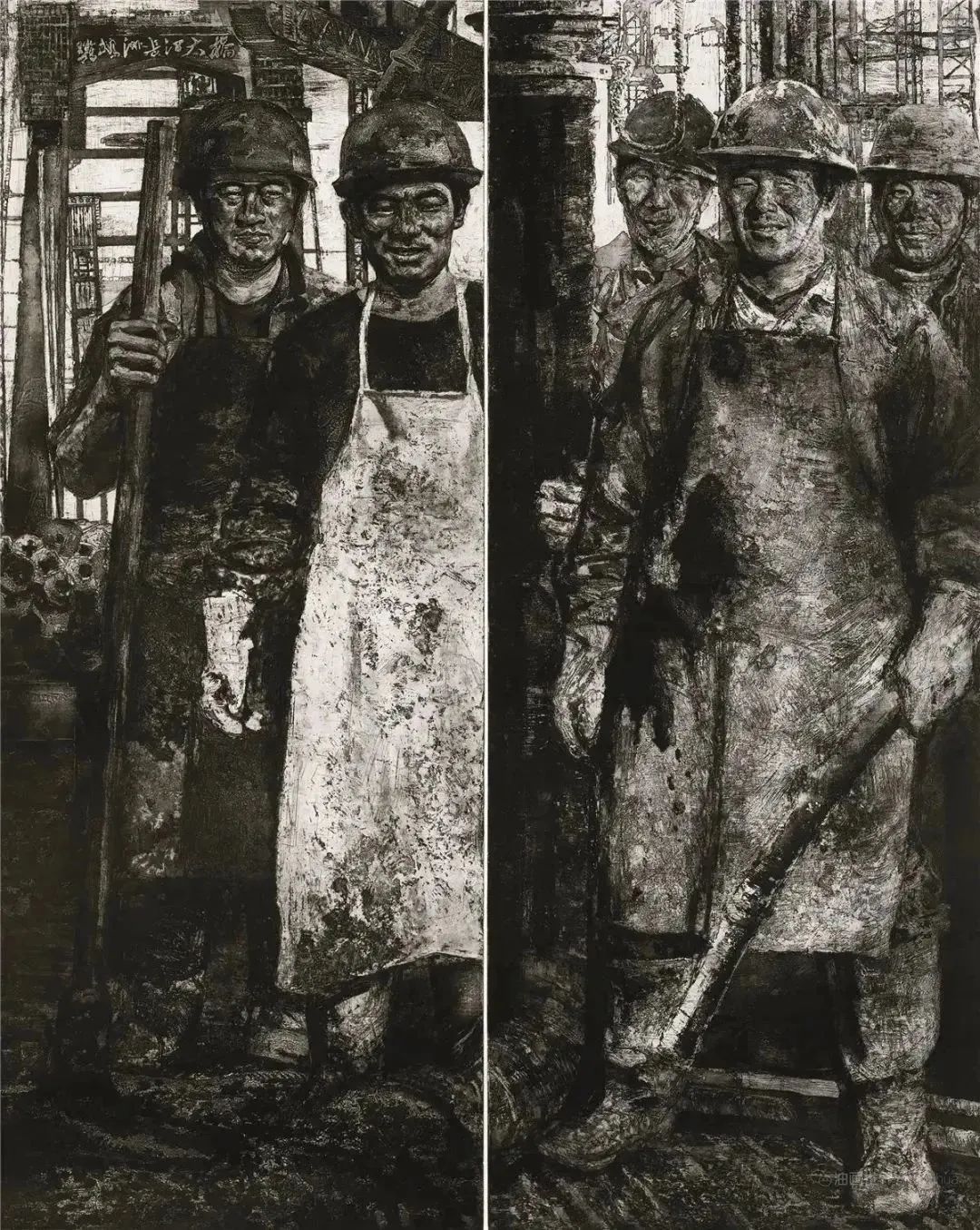版画作品《阳光下的大桥浇筑工》描绘的是武汉长江大桥建设过程中,浇铸工在现场的情形。作者通过几位朴素的浇铸工的形象,表现了灿烂阳光之下建筑工人的形象。这件版画作品技法多样、形式感强,作者能够准确把握鲜明的时代群像特征,将铜版画独特的印痕美学通过具体的人物形象加以呈现,不炫技,不张扬,在内容与形式之间找到了恰到好处的平衡点,使作品的艺术感染力在立意高远的主题框架中自然释放,折射出同为劳动者的版画家严谨、克制的艺术手法与深刻的人文关怀,其从容不迫、真挚朴素的创作态度尤其值得肯定。