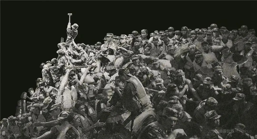 《壹玖肆玖》表现了1949年1月的天津战役中,一位中国解放军战士手持冲锋枪站在金汤桥上远眺的场景。战士面朝冬日的艳阳,身后的滚滚硝烟将他的身影衬托得格外清晰。他头上缠着绷带,眯眼微笑的神情与放松的双手,体现出奋战后迎接胜利的姿态。他昂扬地站着,健壮的身体具有雕塑般的美感,身上的伤口让人联想到战斗的激烈。