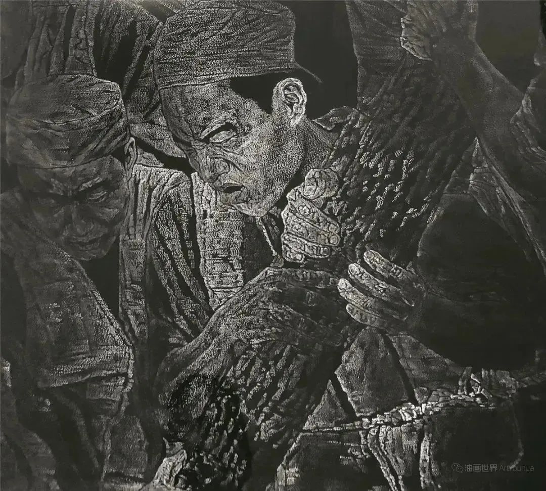 矿工系列作品的表现语言更加奔放和富于激情,大幅度的概括取舍和浓烈的黑白对比形成强大的视觉张力。画面中一张张被尘垢含混了的模糊面孔却有着超乎寻常的力量,直击人们的内心深处,唤起人们对于这些普通劳动者的深切同情!应当说,矿工系列作品使李晓林的艺术理念与创造力得到了充分的表达与释放。