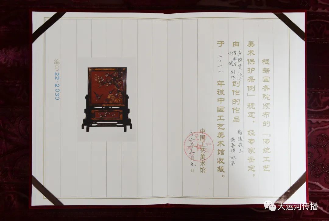 3月26日,漆器工艺大师陈林安收到了中国工艺美术馆的收藏证书,由他担任主创作的雕漆嵌玉作品《鸣喜图》,被中国工艺美术馆收藏。这已是他参与主创的第二件作品被中国顶级工艺美术殿堂永久收藏。此前的2018年,在中国国家博物馆举行的中国当代工艺美术双年展上,他主创作的《雕漆百宝镶嵌五子拜寿》地屏被中国国家博物馆永久收藏。