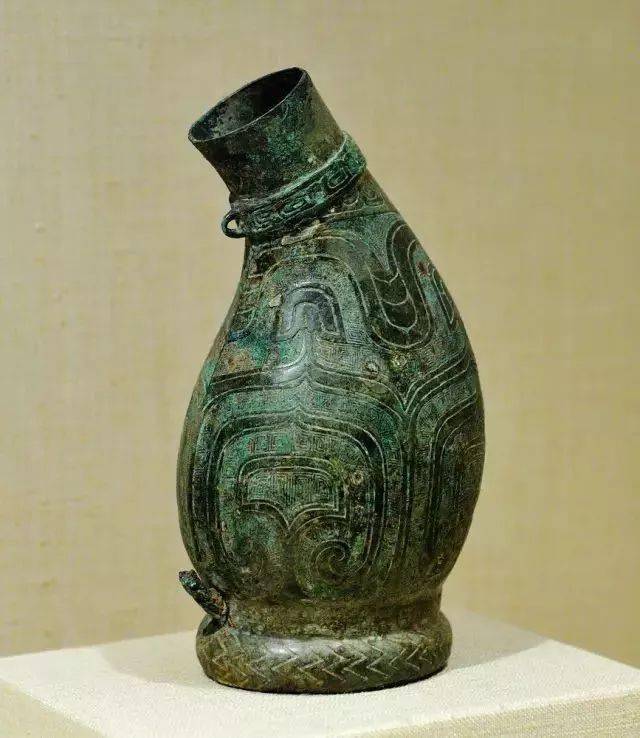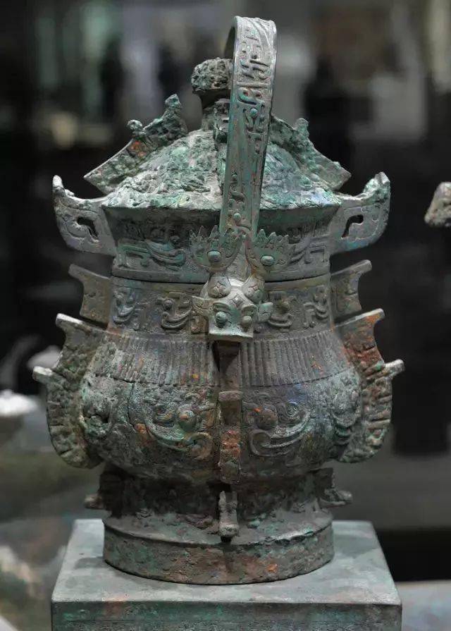 又是一件令人震撼的艺术极品。这件酒容器是代表中国青铜时代晚期的铸造艺术高超水平。表面装饰的图案非常复杂,盖子上的三个横卧动物的设置也许是中原地区与中亚和北亚游牧文化的接触的结果。这个青铜器表面的一部分一直保存在其原始状态,维持着金色的美妙光泽。