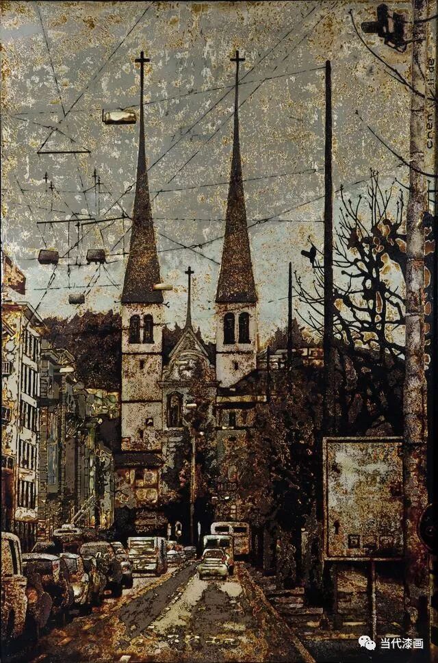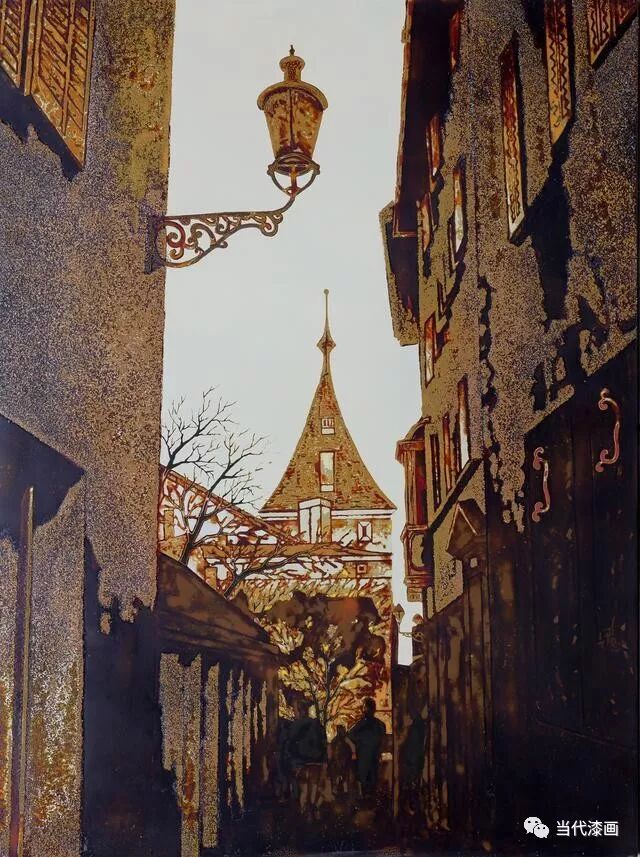 路面上的车流无声的提示了时空节点。这件作品的媒材为大漆与银。技法运用上较为率性自由,建筑,树木与路面的表现技法为堆漆与莳绘交替运用,天地同步贴金和罩明,画面具有浑然天成的整体感。用传统的漆艺技法融合西式的形色和“浅箱式”透视打造出的画面充滿磨显的肌理和温润含蓄的质感,传统材料的美感连同艺术家点石成金的智慧完全被固结在画面中,在此,当代思想融入传统大漆,构建了他对当代艺术语境的鲜活感受与经验的一种表达方式。