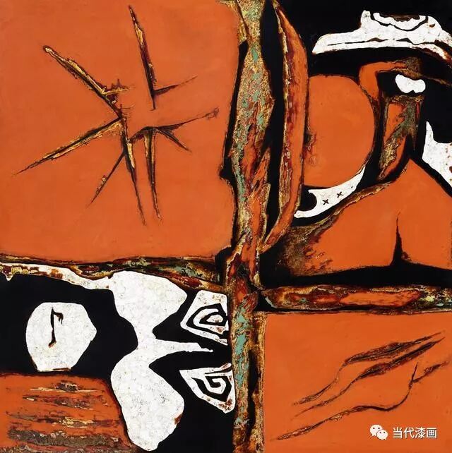 在80年代创作的作品中,画家大多充分发挥大漆艺术的本体语言特色,将深层的思想性理念与简洁的艺术表现手法融合为一体,观者根据题目的引导找到与自己经验世界相重叠的物象,也可以从画面本身延伸想象,补充、参与阅读,由此生成作品的张力和多意性,将传统文化融入当下时代的构想在这些作品中体现的越来越明显。