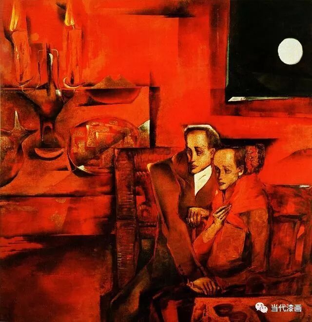 画面空间以喜庆的红色为基调,故土老宅中暮年聚首的一对老人木然相依,高烧的红烛和夜空的满月是象征团圆的传统符号,但烛光的暖红和月光的清凉产生的强烈对比却无声诉说这位海外老华侨和在故土苦侯的结发老妻难以言传的心境,这并不是个案,而是闽南侨乡在特定历史时期的一种特殊历史现象。显性和隐形的绘画空间分割形成一种时空晃然的惆怅的感觉。这些构成元素较准确的表现了这件作品悲欣交集的精神情绪。也比较准确地表达了艺术家在那个阶段的人文思考,以此为开端,促成了他在艺术语言表现方面的转换,此后一系列作品的问世标志着他艺术成熟期的到来。