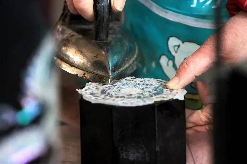 贝壳纸的制作,是把母贝外表又厚又粗糙的韧带皮剥离下来,刨皮、切割、上色、抛光等,历经30多道工艺处理,才能制成薄薄的一张贝壳纸,厚度只有头发丝的十分之一。再把贝壳纸切割成图案,镶嵌在胎体上。