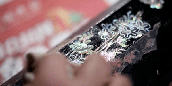 起初是螺贝做最简单的修饰,随着时间的推移,工匠们也发挥了自己的想象力和创造力,把螺贝按照图样在漆面上拼贴成型,这需要将螺贝磨成薄片,这样的设计在唐代就已经出现。