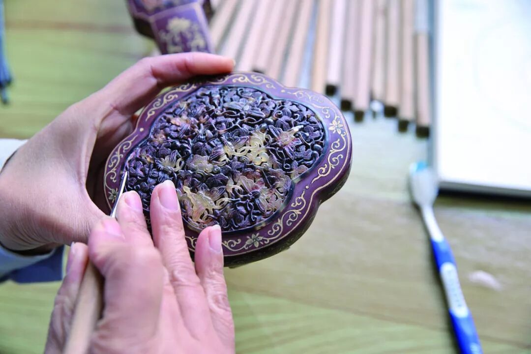 许晓芳介绍,7遍大漆上好后才能进行描金或者雕填。“描金就是根据图案把金箔纸描在上面;雕填就是用笔刀在器物上根据图案刻出细槽,然后把另一种颜色的天然漆填在里边。最后,用各种天然材料进行镶嵌。同时采用搜、磨、堆、铲、镂、雕等技法制成人物、花鸟、山石、楼台等浮雕,镶嵌漆胎之上。”