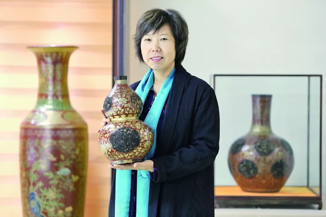 在许晓芳工作室内,半米多高的花瓶《脱胎金漆镶嵌千秋瓶》是她的心头挚爱。这个倾注了许晓芳夫妻二人8个月心血的作品,集“布胎成型”“金漆填描”“玳瑁镶嵌”3种绝活儿于一身,令人过目不忘。