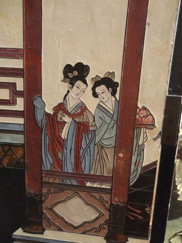 时至今日,我国屏风的传统工艺中依然以款彩为主,搭配螺钿点缀。当然我们大家买的起的一般都是电脑印的,人生如此艰难不要说破……款彩者,即是在灰漆底上涂漆勾花,去掉花形内部的灰泥填以装饰素材或者颜色。原理和雕填工艺其实类似,但规模要大很多,基本上只用来做屏风。现在想想也是不懂,明明日本用屏风用的更多,但怎么就没发展起来呢……