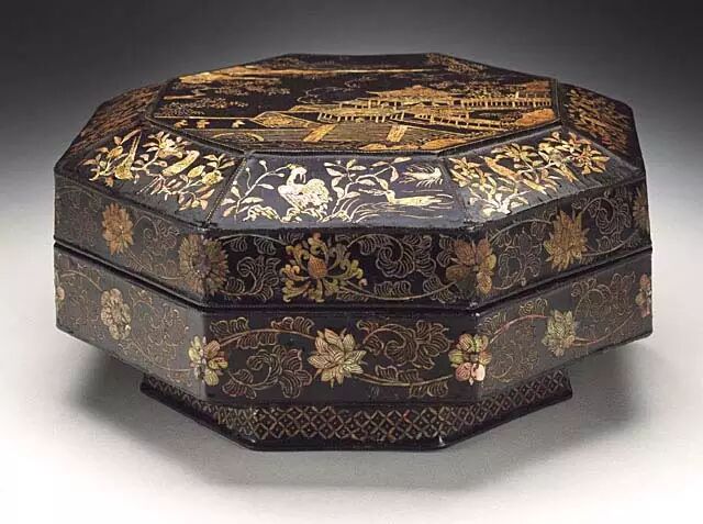 技法上主要是中国漆器更喜欢立体一点的装饰,比如螺钿、款彩和百宝嵌;日本发展出了以莳绘为代表的各式画法,整体造型以平面为主。