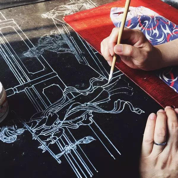 冲绳堆锦结合了螺钿、戗金与款彩三种工艺,先勾出线稿,再挑出黑漆戗金,最后用挑出的黑漆混以金银粉造好贴片,贴在漆器面上。